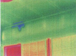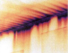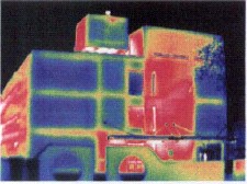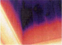 圖4:紅外檢測(cè)清楚的顯示樓房能量損失程度。樓齡為8年,紅外圖象顯示在墻體和房頂都有明顯的熱損失,基礎(chǔ)處也沒(méi)有隔熱處理。對(duì)樓頂進(jìn)行檢測(cè)發(fā)現(xiàn)天花板沒(méi)有安裝隔熱材料。房屋主人知道了熱損失程度,也確切理解了該采取措施進(jìn)行改進(jìn)。修補(bǔ)后可再用紅外檢測(cè)評(píng)估隔熱安裝的效果和質(zhì)量。