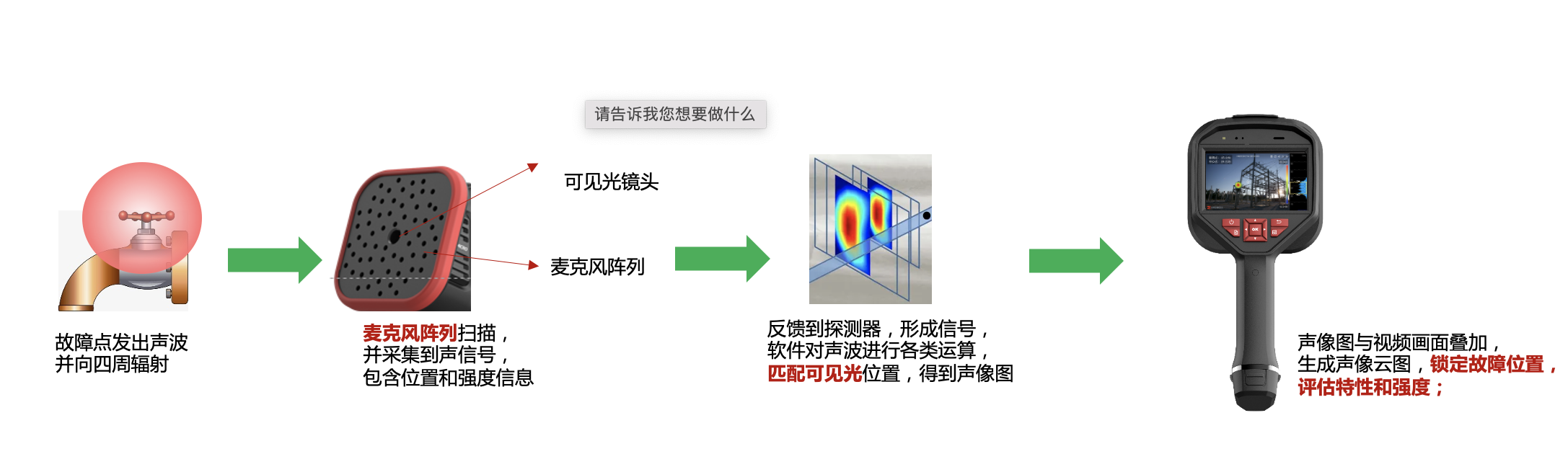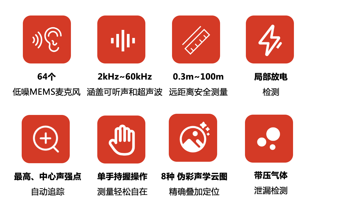 成像原理 聲像儀——又名聲學相機,是利用聲傳感器陣列測量一定范圍內的聲場分布的專用設備。可用于測量物體發出的聲音的位置和聲音輻射的狀態,將采集的聲音以彩色等高線圖譜的方式可視化呈現在屏幕上,有效的測量聲場分布,聲場圖與可見光的視頻圖像**疊加,形成類似于衛星云圖的圖像,對故障位置,故障特性,強度進行顯示。 ![]()