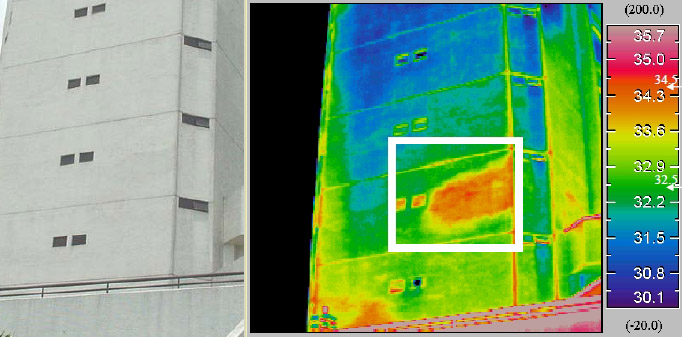 在混凝土建筑物的施工及使用過程中,往往會形成一些缺陷和損傷,造成這些缺陷和損傷的原因是多種多樣的,如:因施工原因導致的混凝土結構內部空洞、不密實區、蜂窩及保護層不足、鋼筋外露等;因溫差、不均勻變形等產生的溫度裂縫、變形裂縫等;因腐蝕介質或凍融作用產生的由表及里的層狀疏松以及一些受力裂縫等。這些缺陷和損傷往往會嚴重影響建筑物的承載能力和耐久性。紅外熱像儀可以方便地檢測建(構)筑物的上述質量缺陷。相對于建(構)筑物某一構件或某一區域,正常情況時,整個構件表層發生的紅外熱輻射應是均勻一致,反映在紅外熱成像上,相應區域的顏色是單一均勻的,不存在明顯的顏色差異,也就是說,不存在明顯的色彩異常區;當非正常時,如構件存在有空洞、不密實區、蜂窩等缺陷時,在這些部位,由于直接改變了構件表面與內部的熱導通性,因此會存在相對于正常部位的紅外輻射異常。在這種情況下,紅外熱能圖片上反映的顏色非單一均勻,不同熱輻射條件的構件表面對應不同的顏色(色彩異常)。紅外處理熱能圖片上的顏色異常區,通過與可見光數碼照片的比較判斷,可以直觀明了地看到異常區在實際構件的位置。