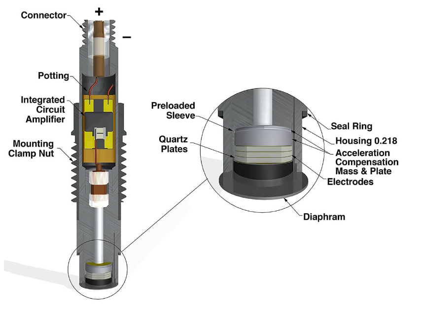 大多數(shù)PCB?壓電型壓力傳感器中的石英晶體在堅固的傳感器外殼內(nèi)采用壓縮式預(yù)緊,電氣石晶體采用無約束形式。這些設(shè)計使傳感器具有微秒級響應(yīng)時間和幾百赫茲的固有頻率,能夠*小化過沖或者振鈴現(xiàn)象發(fā)生的可能性。
