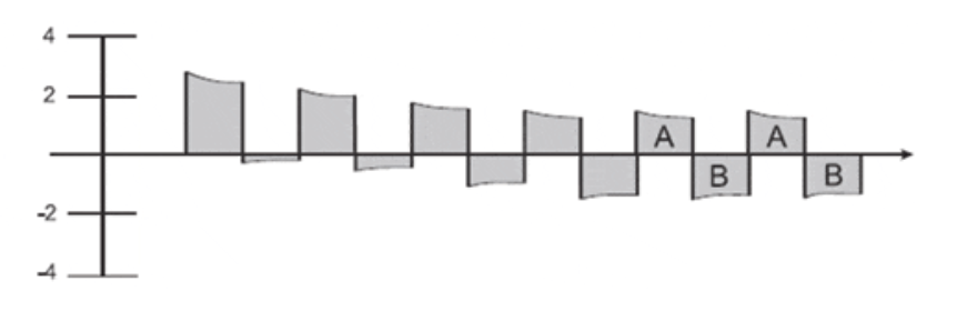 在這個例子中,在一個穩(wěn)態(tài)脈寬和脈沖間隔為一秒的AC耦合壓力應(yīng)用,產(chǎn)生0-2V電壓輸出信號。其頻率保持不變但信號迅速衰減,直到信號在原始基線上下面積區(qū)域A=區(qū)域B,而且峰值相同。